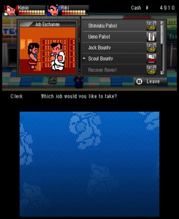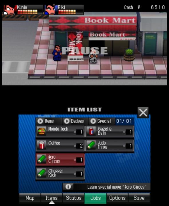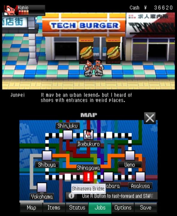 River City: Tokyo Rumble follows the story of a hot-blooded high school student named Kunio and his good friends. When a nefarious gang moves into Tokyo to try to take it over, it's up to this self-proclaimed "fighter for justice" and his buddies to make sure the streets stay safe! Punch, kick, use weapons such as soccer balls, iron knuckles, chains, and even bicycles to knock some sense into those devious gang members. Take on jobs, level up your abilities, and don't forget to stop on occasion for a snack or two at the local food joints. Luckily, smiles are free!