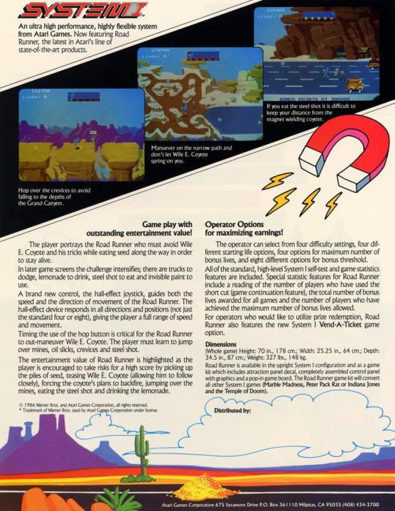 The player takes on the role of the Road Runner - from the much-loved Warner Bros. cartoon series - and must outrun and outsmart the villainous Wile E. Coyote, in this abstract sideways-scrolling racing game from Atari. A variety of traps and pitfalls await the Road runner (such as a cannon, land mines, cliff-top drop etc.) which must be carefully avoided. It is possible, however, to lure Wile E. Coyote into these traps to put some valuable distance between the Road Runner and his pursuer. Road Runner must also eat the piles of seed that appear at various points throughout the stages, as missing five bird seeds will cause Road Runner to faint and result in the player losing a life. Road Runner's colourful, beautifully-drawn graphics capture the spirit and humour of the legendary cartoons perfectly. The music and sound effects are also faithful to the cartoon series.