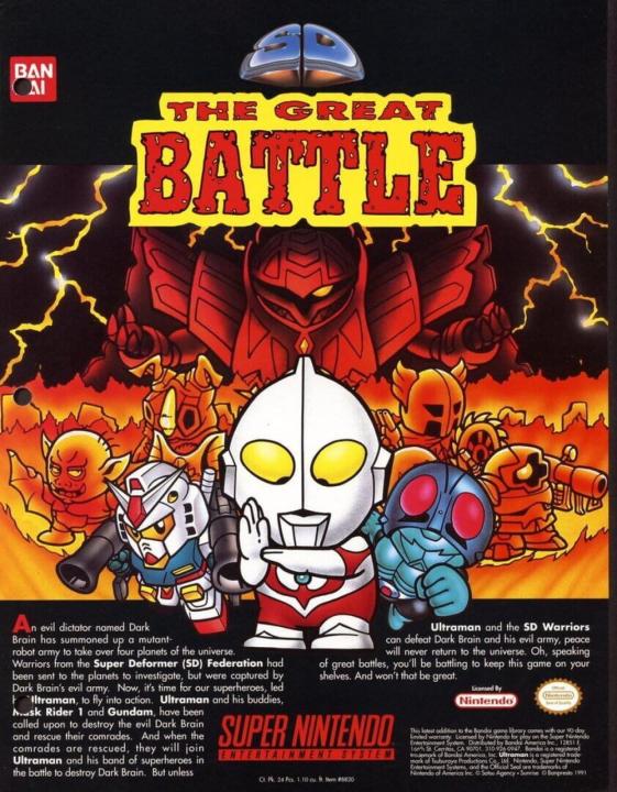 SD The Great Battle is an Action game, published by Banpresto, which was released in Japan in 1990. A North American localization was planned and marketed, but was cancelled.