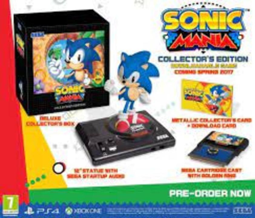 A collector's edition to promote Sonic Mania. It contains: - Deluxe "SEGA Genesis" style Collector's Box - 12" Classic Sonic Statue featuring SEGA Genesis Base - Metallic Collector's Card with Sonic Mania Download Code (digital game code) - SEGA Cartridge Cast with Golden Ring