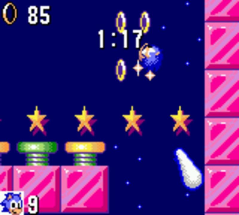 This is a completely different game than its 16-bit counterpart on the Genesis/Mega Drive, and was originally released on the Sega Game Gear and Master System. To stop the evil Dr. Robotnik, Sonic must traverse six zones consisting of three levels each. Most of the zones are based on those in the original game, but some are entirely new, including a jungle environment and a huge airship. Other unique differences are one level that scrolls automatically and one that is aligned vertically instead of horizontally. Most of the enemies (mechanized animals, defeated by Sonic's spikes when jumping or rolling) and power-ups (speed-ups, shields, extra lives) are the same as in the Genesis version as well. Sonic can pick up golden rings for protection (when hit, he simply loses all of his rings instead of a life) and bonuses: 100 rings gain Sonic an extra life, and 50 remaining rings at the end of a level allow access to pinball-themed special stages full of bumpers and springs. The final level of a zone is always a boss fight against Robotnik. Some of the boss fights differ in the Master System and Game Gear versions of the game, with special designs for the handheld version due to the smaller visible screen area. Sonic should also collect the six Chaos Emeralds to keep them from falling into Robotnik's hands. In a departure from the original game, these are not hidden in the special stages but somewhere in the regular levels.