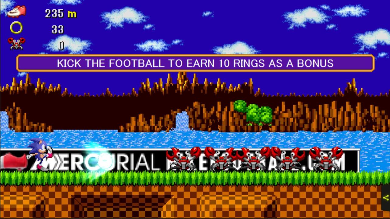 Sonic x Vapor was a promotional advergame released in 2012. It was a collaboration between Sega and Nike to promote Nike's Vapor shoes. The graphics and gameplay are based on those of the original 16-bit Sonic the Hedgehog, though Sonic's sprites have been altered so that he wears the eponymous shoes. In the game, Sonic runs endlessly through a level. The player must destroy Badniks and collect Rings for points. The player will encounter soccer balls, which can be kicked to destroy Badniks. Speed increases as the game goes on. Losing a life ends the game. After the game ends, the player may post their score on their Facebook or Twitter account.