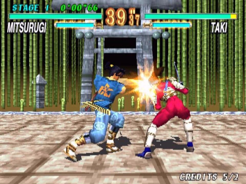 Soul Edge is a 3D arcade fighting game and the first in the Soul series, it is one of the first 3D fighting game in history that place a particular emphasis on the story of the fighters. Each character have their own weapon, allowing for a wide range of play styles. The slower, longer ranged characters try to deliver their heavy blows from a distance whereas the quicker, faster characters try to get in as close as possible and deliver quick-hitting attacks.