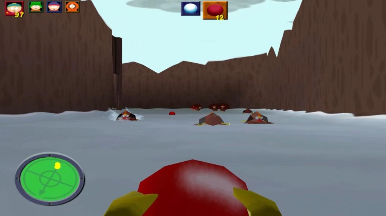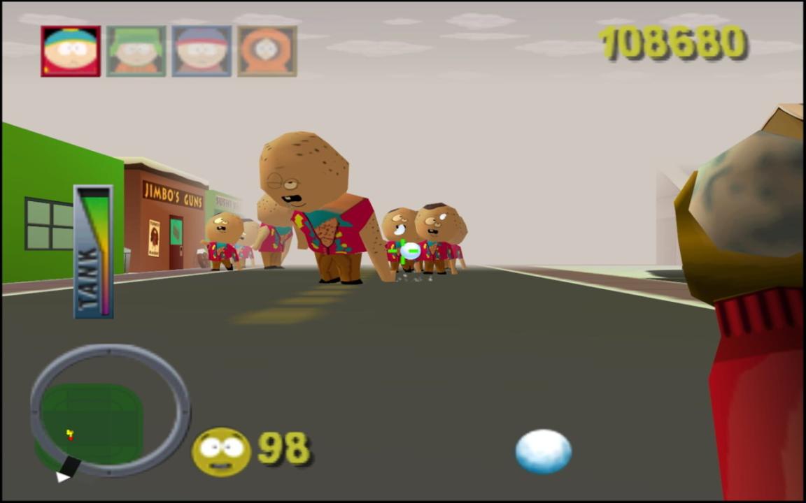 Single player takes the form of a "Story" mode divided into five episodes and fifteen linear levels. The player will face weak minions (which change based on the episode), plus occasional sub-bosses which will try to escape into town. The final level is devoted to a unique boss fight. Players use quirky weapons ranging from infinite yellow snowballs to cow launchers and toxic Terrance and Phillip dolls. Every weapon has a secondary fire, and players switch between the four main characters when they switch weapons - each of the four kids shares a single life bar because of this. The kids will comment on game actions as they occur, with heavier profanity censored with bleeps. The kids will get angrier (and fouler) as their health depletes, until they finally give up on saving the town and go home.