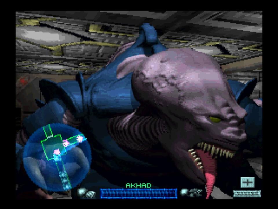It's the 41st Millennium. For 20,000 years mankind has expanded forth throughout the galaxy aided by a phenomenal invention known as the Warp Drive, which allows huge spatial distances to be traversed in a matter of hours. Under the auspices of the Emperor; a psychic so powerful he is essentially immortal, a pan-galactic Imperium has been established in which mankind has spread and prospered. The defenders of the Imperium are the Adeptus Astartes, or Space Marines, bio-genetically engineered warriors of superhuman prowess, ever vigilant to destroy the many threats that face mankind across the cosmos. The player is one such Space Marine, belonging to one of the oldest and most honourable Chapters known as the Blood Angels, whose battle honours date back as long as the Imperium has existed. You have acquitted yourself well even among such heroic company, and it is thus that the player finds him/herself assigned to the Terminator company. Among the thousand warriors that compose a Space Marine Chapter, only the hundred most valorous and gifted brothers are deemed worthy enough of this honour. Terminators are the Chapter's ultimate warriors. Protected by this suit that makes them all but impervious to conventional weaponry, and armed with the most devastating weaponry available, Terminators stand in fear of no foe, no matter how potent. Among the most insidious of mankind's enemies are Genestealers, a strange and terrifying alien race, reptilian in appearance, they are huge armoured six-limbed beasts, preternaturally swift and unbelievably ferocious in combat. A genestealer knows no fear, charging into combat irrespective of any threat to its life. Incredibly hard to kill and all too capable of inflicting death themselves, it is no surprise that Genestealers are considered one of the foremost threats to mankind's survival. However, there is another more frightening element to their nature: Genestealers are incapable of reproducing amongst themselves, and must rely on other races to expand their population. The method they employ for this purpose is terrifying upon encountering a suitable host, such as a human being, a Genestealer will fix its piercing eyes upon it, mesmerising it much like a Terran snake does its prey. While the host is thus hypnotised, the Genestealer will extend its tongue, which contains a hollow, pointed tube known as the ovipositor in a gruesome parody of a kiss, depositing a small egg-like cell that contains the Genestealer's genetic profile. This cell behaves like a cancer, malignantly coursing through the host's system and altering its genetic profile. The victim shows little outward sign of the infection - in fact, he gains some of the 'Stealer's remarkable strength, resilience and longevity, becoming healthier than he was before. The effect is only really evident once the victim comes to reproduce. Once they come to mate, the offspring of any victim is born as a Hybrid, a corrupt creature exhibiting characteristics of both Genestealer and host species. The Hybrid itself is equipped with an ovipositor, which it uses in a similar manner to its Purestrain parent. This cycle continues, with each new generation of Hybrid resembling the host species more closely. By the fourth generation, the offspring is barely detectable as alien save for a few give-away signs such as unnaturally sharp teeth and a purplish tinge to the skin. The offspring of this fourth generation is procreated in the conventional manner, and can result in either a Hybrid, a normal member of the host species or a Purestrain Genestealer, the only manner in which Purestrains can be produced. All the generations are linked in a psychic community, so Purestrains, Hybrids, and hosts all conceive of themselves as constituents of the same brood. The manner in which Genestealers carry out their reproductive process is of exceptional danger to the Imperium, as whole planets can fall to the Genestealer threat; the affected humans look and act no different from normal, and the hosts are extremely secretive about the insidious curse they bear. Indeed the first an external agency may know about the presence of Genestealers is once a whole planet has been affected by the curse, requiring total cleansing and repopulation. Imperial authorities are thus extremely keen to terminate the Genestealer menace at source, before it has a chance to affect any nearby planet. The prime manner in which Genestealer came into contact with humanity is through the use of Space Hulks. These are spaceships of human origin which have become lost in Warpspace, either through a malfunction of the ship's Warp Drive, or just as a consequence of travelling in a medium as uncertain as Warpspace. The human occupants having died, Genestealers and their Hybrid brood move in, settling down to hibernation until the drifting Space Hulk comes into contact with a species riper for infiltration and domination. So thus, it is that whenever a Space Hulk is detected in the proximity of a human planet, the stalwart warriors of the Space Marines are detached to rid the Hulk of its Genestealer cargo, preventing any chance of another planet falling victim to the Genestealer curse. Such is the combat prowess of the Genestealer that only the Terminator squads have met with any success. That is the player's status and this is the player's mission: rid the galaxy of the Genestealer menace once and for all.