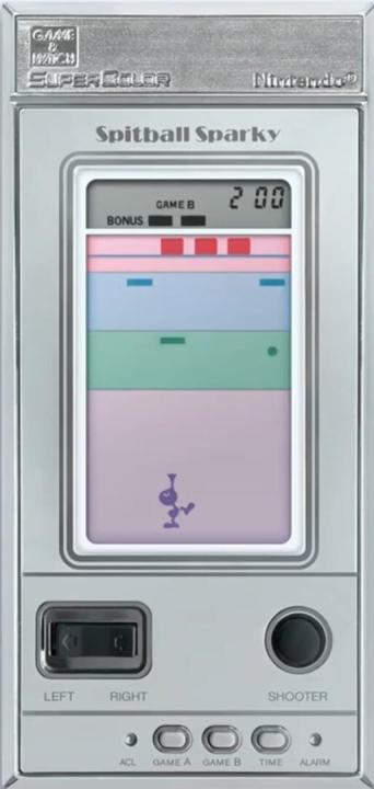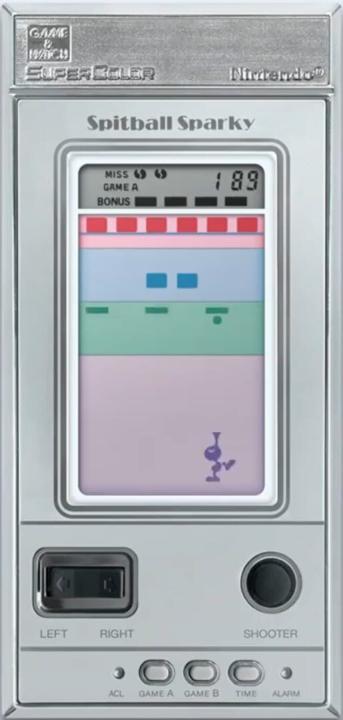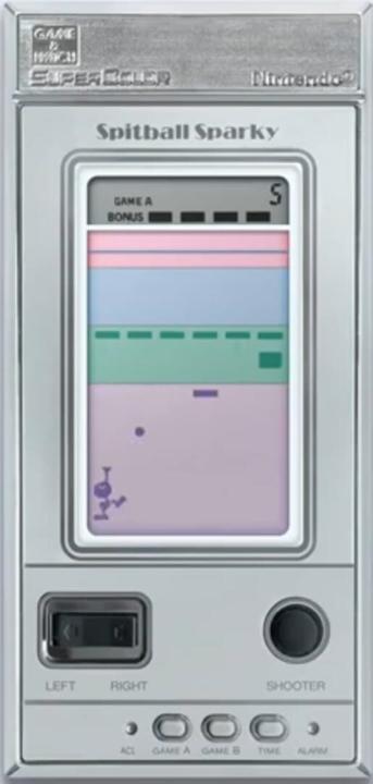 Spitball Sparky is a Super Color Game & Watch game released in 1984 by Nintendo. The game's model number was BU-201, and the contents within the box included the game, LR44 batteries, a caution leaflet, a how to play leaflet, and battery stickers. The game is very similar to the arcade classic Arcanoid and has colors due to the layers of colored plastic overlay. Your goal is to spit on the ball so that it'll go back up and destroy the blocks at the top. The unit was rectangular and silver. When Nintendo of America released the game in America, they made artwork for the game that had a more detailed character.