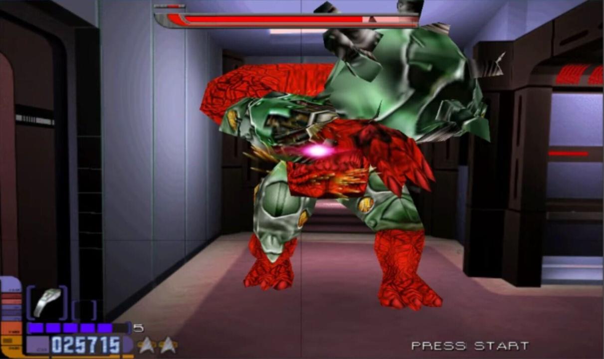 After a hearty "Welcome aboard!" from Captain Janeway, you start your adventure on Voyager, which is quickly overrun with Borg. After 6 shots, your phaser must be "recalibrated" by firing off-screen. The game includes occasional opportunities for weapons upgrades, life upgrades and bomb detonation. The game expands to various areas of Voyager and to the Borg ship, and introduces additional aliens along the way. The game also includes a space scenario which simulates a shuttle flight where you fire at various Borg ships.