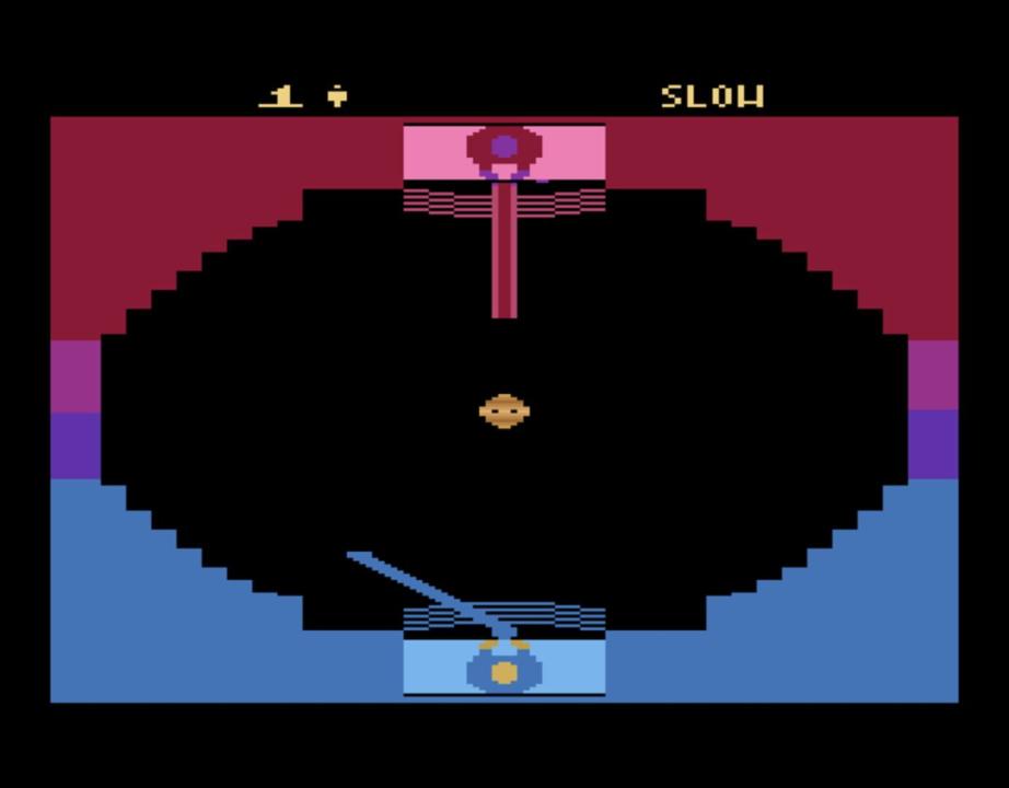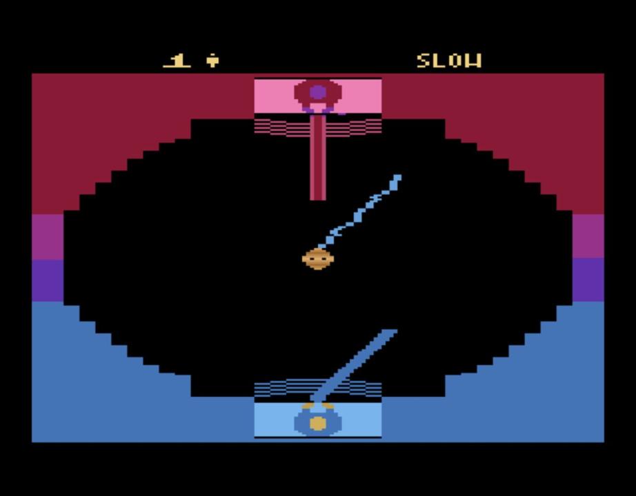 In Jedi Arena, you have to face an opponent in the arena to see who is the true Jedi master. Wandering throughout the arena is a seeker which is capable of firing laser bolts. To be victorious you need to destroy your opponents shield by having the seeker fire laser bolts at it. You are armed only with a light saber which is used to control the direction of the laser bolts you fire, as well as block incoming fire from your opponent. The first player to break through the other players shield wins a point, and the first player to 3 points wins the match! Several game options are included which control the speed of the seeker, or even make the seeker invisible.