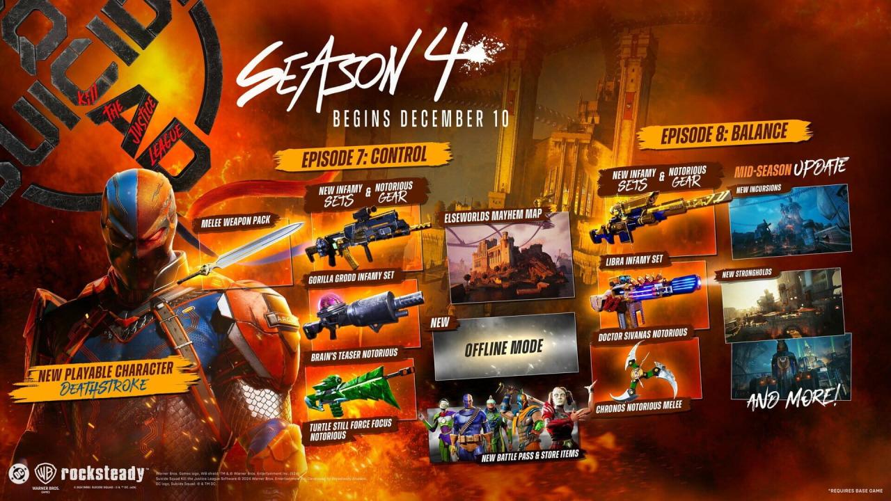 Season of Deathstroke of Suicide Squad: Kill the Justice League delivers the final content updates for the game, bringing new features and enhancements. This season introduces Deathstroke as a playable character, alongside new melee weapons, Infamy sets, Notorious gear, and a fresh map called Elseworlds Mayhem. The season is divided into two episodes—Episode 7: Control and Episode 8: Balance—culminating in a battle against Brainiac.