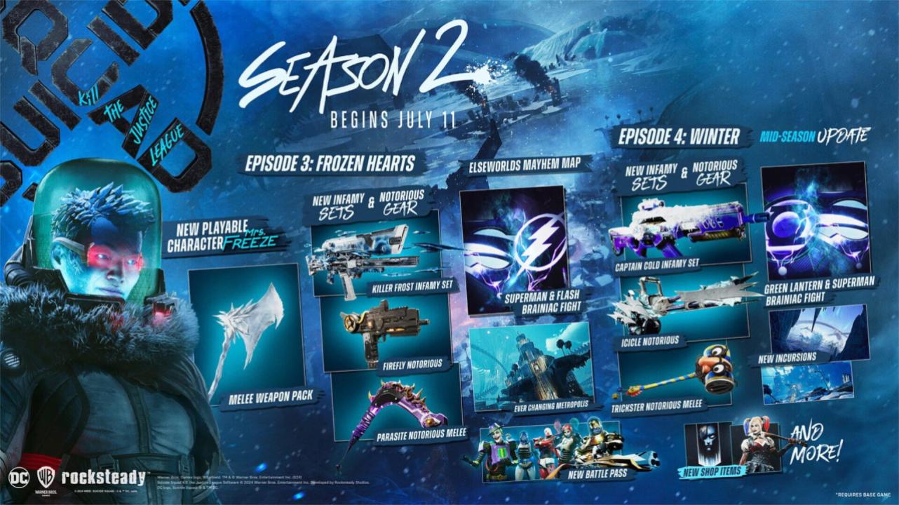 Suicide Squad: Kill the Justice League – Season of Freeze launched on July 25, 2024, adding Mrs. Freeze as a playable character, a frozen Elseworld location, new missions, Infamy gear sets, and a Battle Pass with themed cosmetics. The update is available for all platforms as a free expansion.