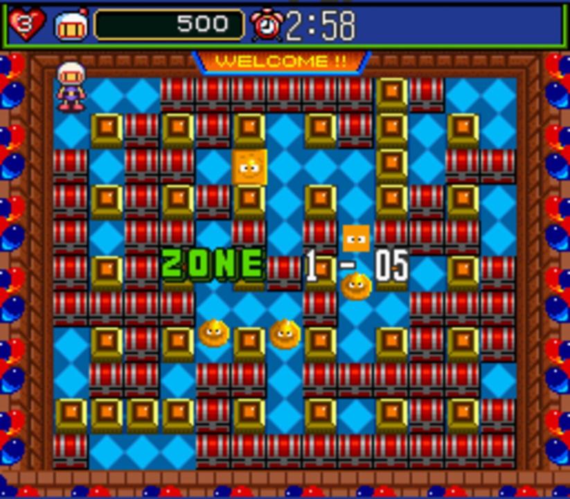 An evil Bomber named Emperor Terrorin who has the power of Time itself has freed various criminal Bombers from their prison cells in orbit around Planet Bomber. Setting them up in a warped time and space, Shirobon, Kurobon, and their Louie (Rui) companions must travel through stages and defeat them before going up against Emperor Terrorin himself. Super Bomberman 5, released by Hudson Soft in early 1997, was the final Bomberman game released on the Super Family Computer - the Japanese version of the SNES. The game was released in two variations: a standard cartridge and a gold cartridge, which was sold exclusively through CoroCoro Comic. The gold cartridge included extra maps in battle mode.