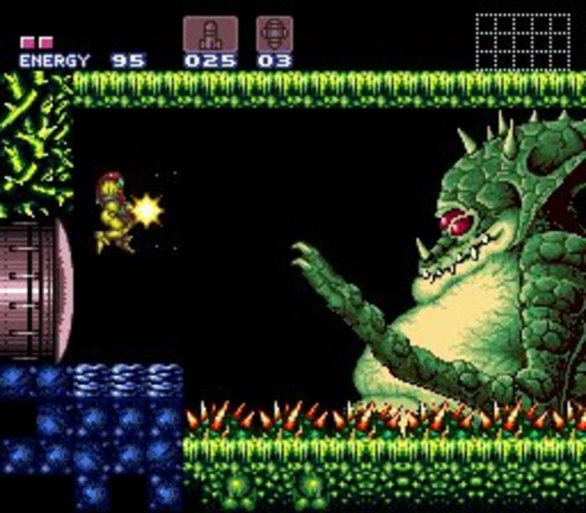 The Space Pirates, merciless agents of the evil Mother Brain, have stolen the last Metroid from a research station, and once again Mother Brain threatens the safety of the galaxy! Samus Aran must don her awesome array of high-tech weaponry to retrieve the deadly Metroid hidden deep within the cave-riddled planet Zebes. Super Metroid features excellent graphics, with a huge variety of enemies and worlds to explore. The side-view action will be familiar to many players, only now there are new weapons and items, including the Grappling Beam, which allows Samus to swing across large chasms, and the X-Ray Scope, which reveals secret passages.