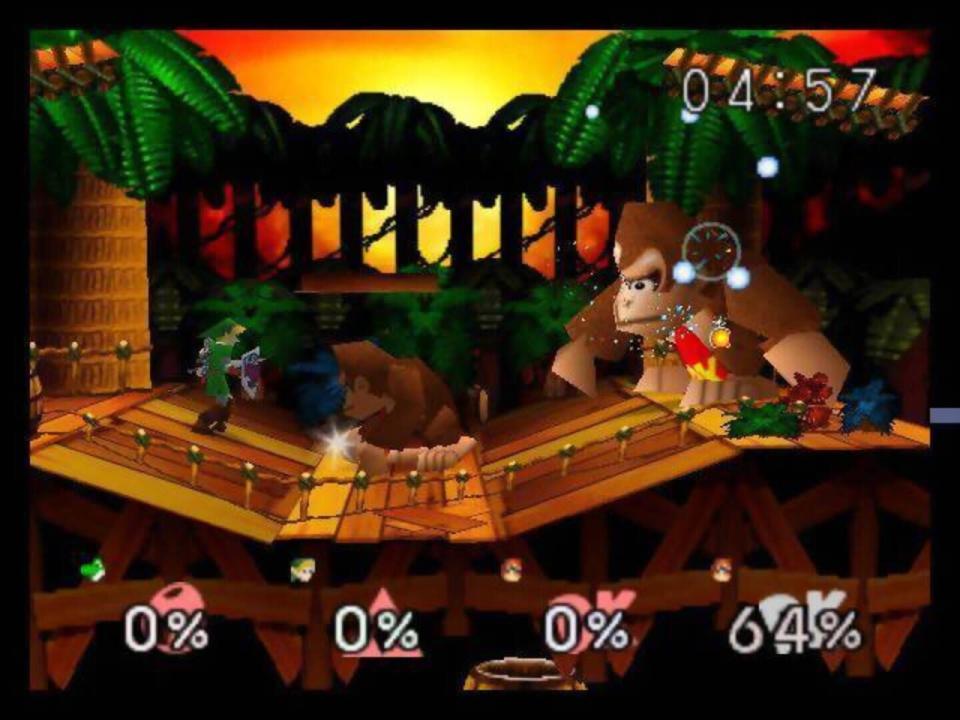Super Smash Bros. is a crossover fighting video game between several different Nintendo franchises, and the first installment in the Super Smash Bros. series. Players must defeat their opponents multiple times in a fighting frenzy of items and power-ups. Super Smash Bros. is a departure from the general genre of fighting games: instead of depleting an opponent's life bar, the players seek to knock opposing characters off a stage. Each player has a damage total, represented by a percentage, which rises as the damage is taken.