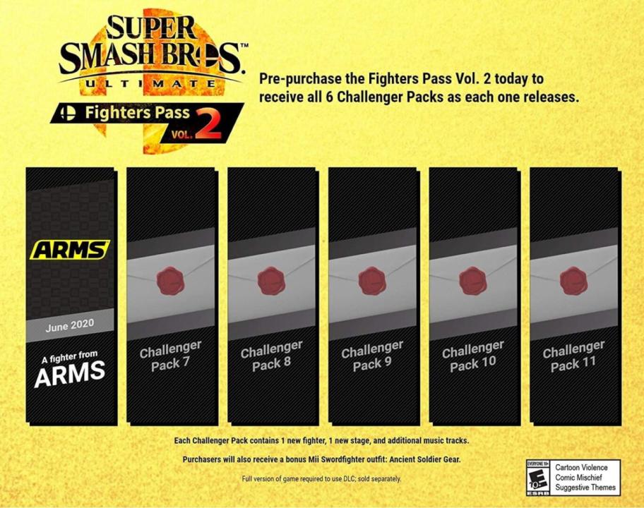 The second and final set of DLC characters for Super Smash Bros. Ultimate. Fighter DLC to be released by the end of 2021. "Expand your roster even more with six additional playable fighters, plus additional stages, and music as they release. Purchasers will also receive a bonus Mii Swordfighter outfit: Ancient Soldier Gear."