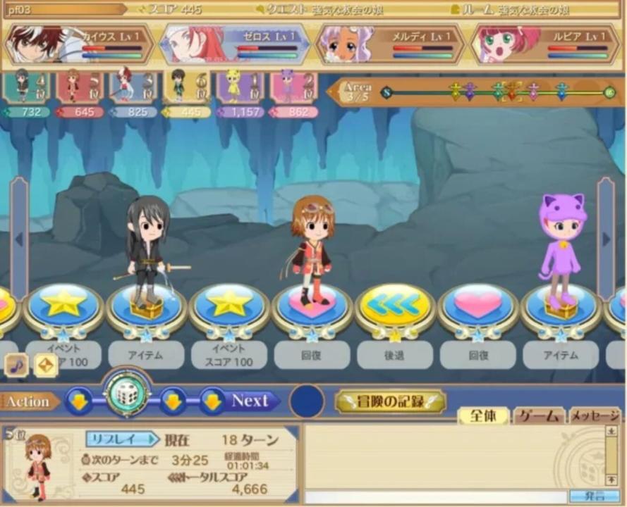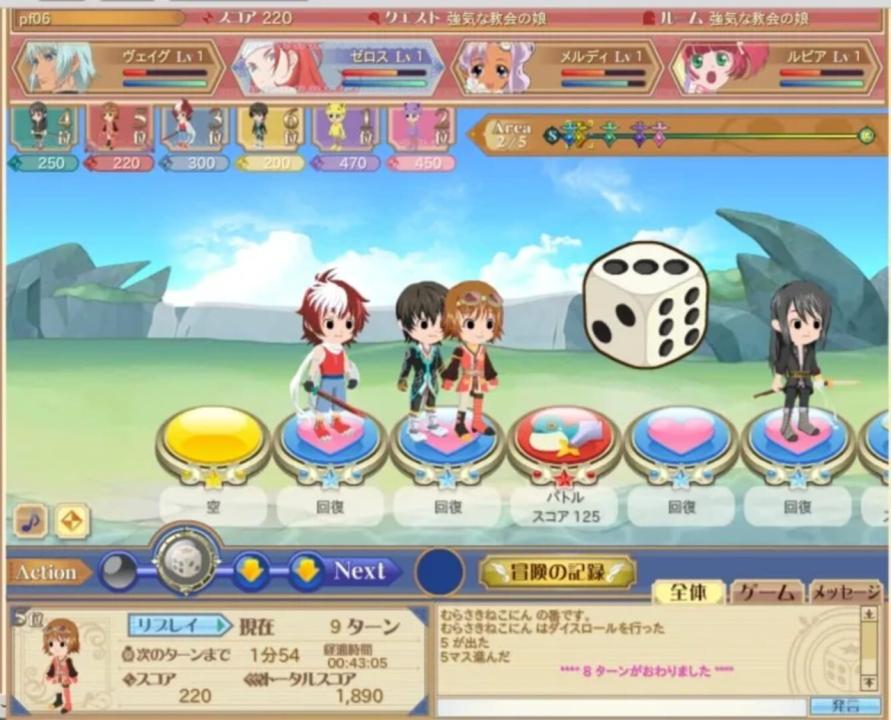 Tales of the World: Dice Adventure is a web browser-based board game in the Tales series released April 26, 2012 in Japan. The game is a role-playing and board game hybrid, where the player rolls virtual dice to determine how much a character moves across the board. Through the course of traversing the board, the player can form parties with other characters, experience story events, and participate in battles.