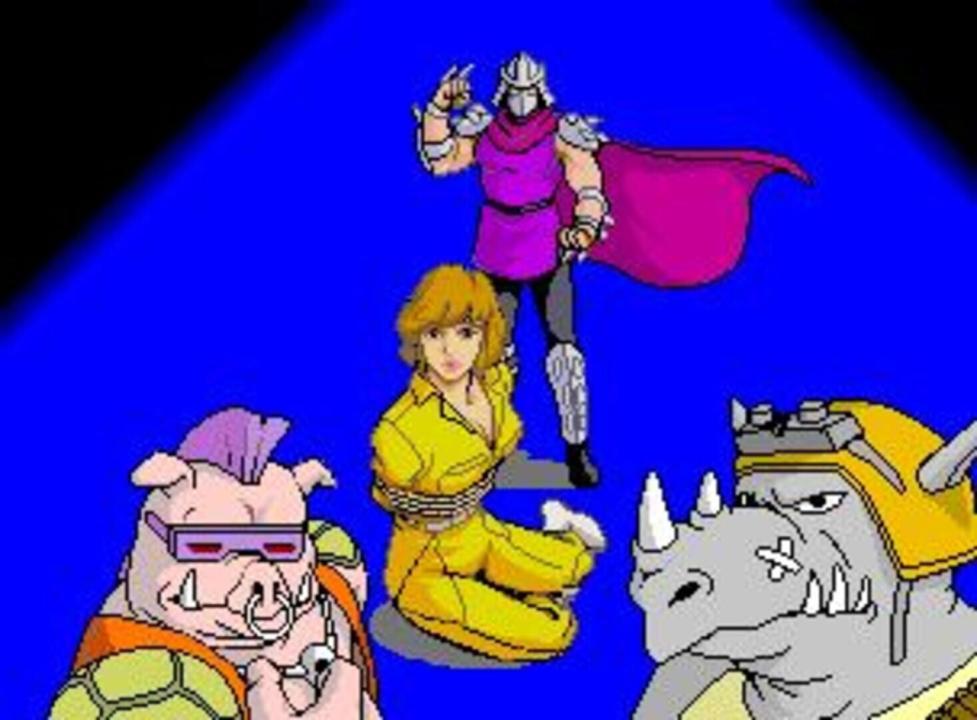 NOTE: This is the original 4-Player Arcade release, not the NES Title. The player chooses from one of the four Ninja Turtles: Leonardo, Michelangelo, Donatello, and Raphael. After Shredder kidnaps the Turtles' friend April O'Neil and their mentor Splinter, they must give chase, save their comrades, and defeat the evil Shredder. The player chooses from one of the four Ninja Turtles: Leonardo, Michelangelo, Donatello, and Raphael. Depending on the version of the game, the characters are either, chosen at the start of the game or assigned by control panel. After Shredder kidnaps the Turtles' friend April O'Neil and their mentor Splinter, they must give chase, save their comrades, and defeat the evil Shredder. Up to four players (two in some versions) can take control of any of the Turtles. Donatello has slower attacks but a longer range, Michelangelo and Raphael have faster attacks but a shorter range, and Leonardo is a well-rounded Turtle with average range and speed. The eight-way joystick controls the movements of the Turtle, the jump button makes them jump and the attack button makes them hit in front of them using their weapon. In addition to this, some combinations are possible. The Turtles can throw Foot soldiers overhead, and by pressing the jump and attack buttons, a special attack is performed. Raphael rolls along the ground and finishes with a kick, while the other Turtles do a sweeping jump attack with their weapons. Turtles can also spring off the wall in certain areas. Enemies can be defeated more quickly by slamming them into walls or solid objects. Many objects such as traffic cones, parking meters, fire hydrants and exploding oil drums can be hit or damaged with attacks in order to help defeat nearby enemies. In the attract mode, the game showed the first part of the cartoon opening, along with a portion of the Teenage Mutant Ninja Turtles theme song. Most of the enemies the Turtles face are the Foot Soldiers, all color-coded to indicate their attack patterns and weapon of choices. Some enemies, such as the standard purple-clad Foot Soldiers and Roadkill Rodney robots, have the ability to restrain the Turtles' mobility and drain their health, leaving the player open to attack for other enemies. The bosses in the game include Rocksteady and Bebop (individually at first in that order, and later the two of them together), Baxter Stockman, Granitor, General Traag, Krang, and Shredder himself.