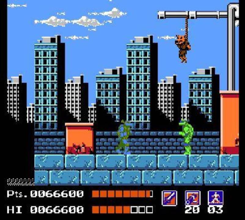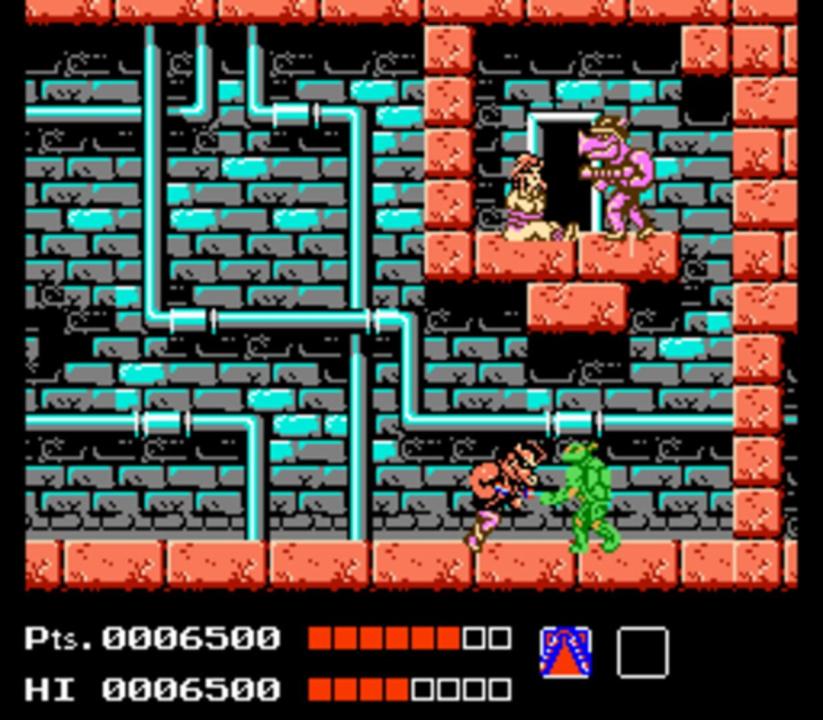 Shredder kidnaps April and gains the Life Transformer Gun, a weapon capable of returning Splinter to his human form. In order to save April, the turtles (Leo, Mikey, Donny and Raph) embark on the streets of New York to confront the Foot Clan. While traversing the sewers, the turtles encounter Bebop, a mutated pig, and Rocksteady, a mutant rhino. Though the turtles defeat Bebop, Rocksteady escapes with April O’Neil. The turtles then chase Rocksteady to an abandoned warehouse, fight him, and rescue April. After disabling bombs in the Hudson River dam, Shredder captures Splinter, so the turtles give chase in the Party Wagon. Hot in pursuit, the turtles scour the city and eventually find that Splinter is held captive by the robotic Mecaturtle on a skyscraper rooftop. After the turtles save Splinter, Shredder escapes in a helicopter. The turtles give chase, tracking him to JFK airport, where they encounter Big Mouser. After defeating Big Mouser, the turtles head to Shredder's secret Foot Clan base in the South Bronx via the Turtle Blimp. Once there, they locate and battle the Technodrome underground. The turtles descend into the Technodrome's reactor and ultimately defeat Shredder. With the Life Transformer Gun, the turtles help Splinter return to his human form. With a tough mission accomplished, the turtles and April celebrate with a pizza.