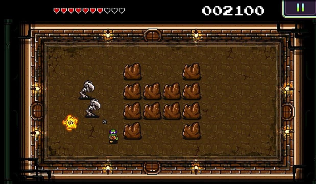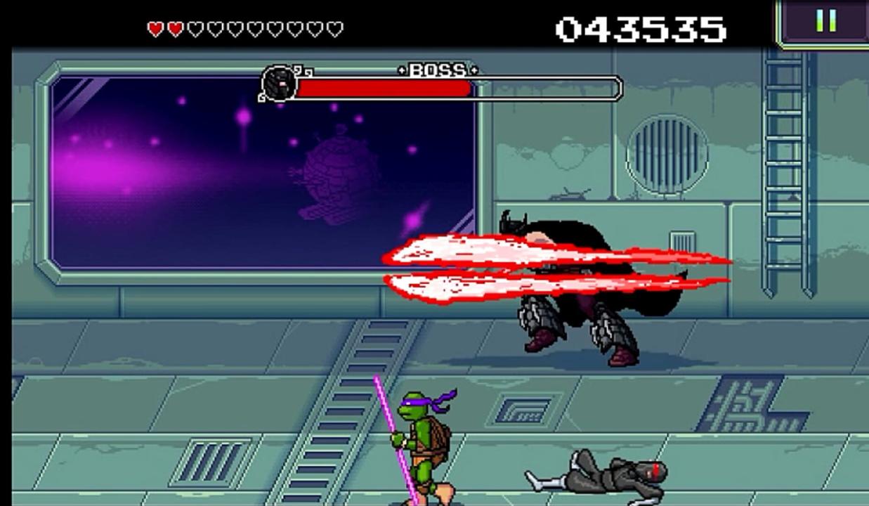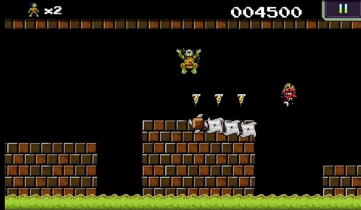 Donatello falls asleep while playing video games, and dreams that he goes through several TMNT-ized classic games to rescue "princess" April. At the end of each level, he encounters one of his brothers, dressed up like the princess that fits that level's theme. After he rescues each, they say, "The princess you are looking for is in/on another dungeon/castle/space ship." The first level is based on The Legend of Zelda. The boss for this stage is a Kraang, and the princess, based on Zelda, is Raphael. Level 2 apes Super Mario Bros. and has Fishface as the boss. This Peach-like princess is Michelangelo. The final level plays similar to classic TMNT games and has a distinct Star Wars homage atmosphere. The boss is a Darth Shredder and the princess is a Leonardo Leia. Outside of one of the windows, The Technodrome from the original cartoon series can be seen.