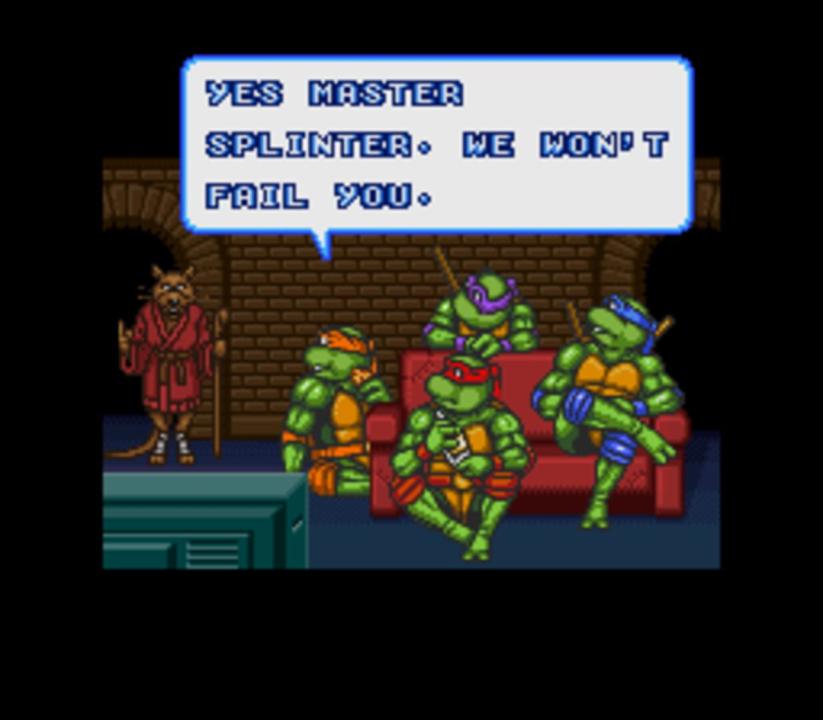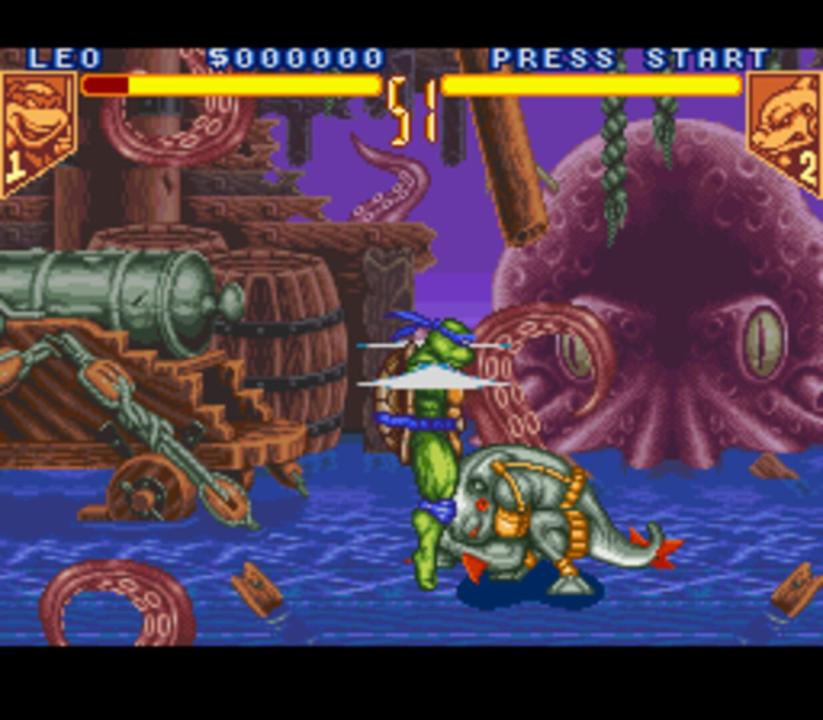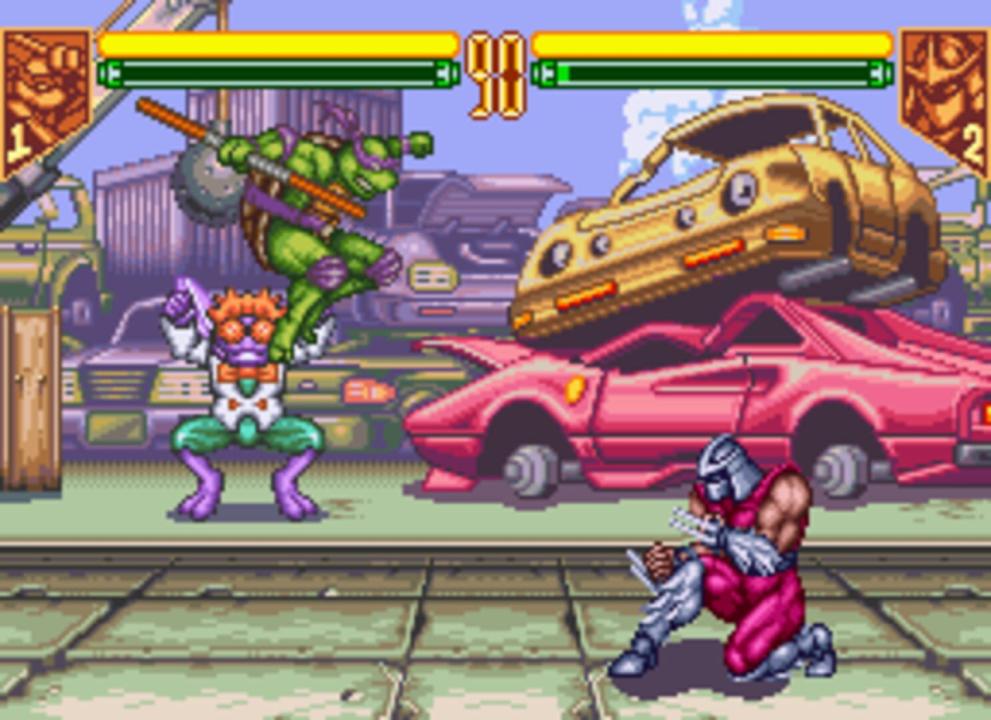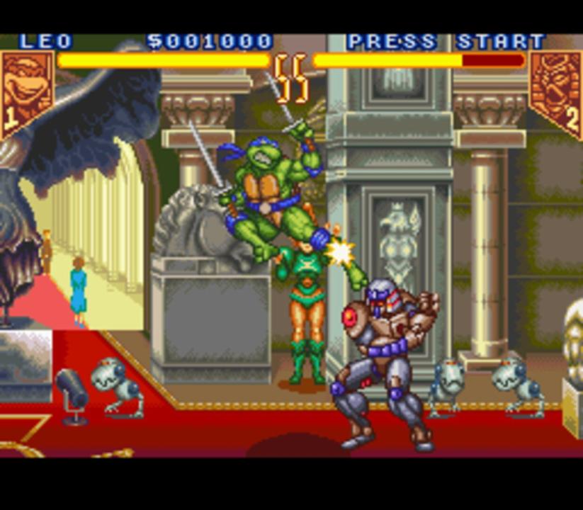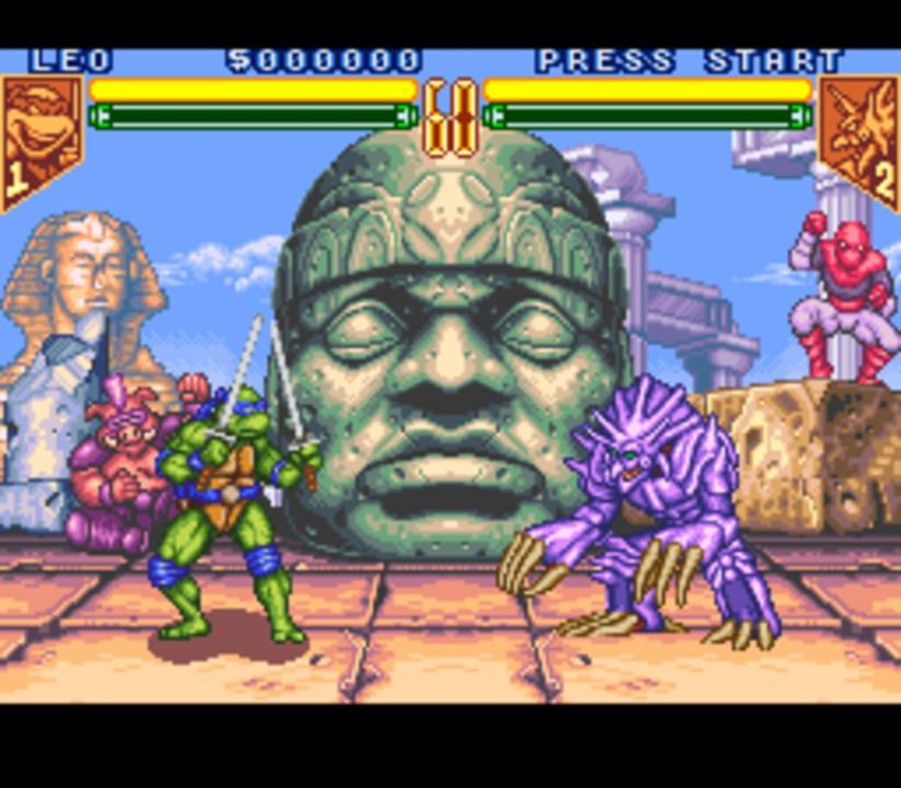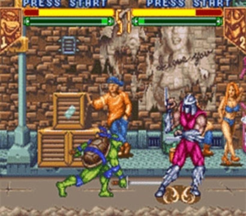 This game's controls use a four-button scheme (two punches and two kicks, weak and strong). A particular feature is the possibility to use a super special attack. In order to achieve this, the player must fill a green bar under the life bar, by hitting their opponents. Once full, the player must press the two strong attack buttons simultaneously. There is also the option of enhancing the speed of the game, making the fights more intense but also more difficult to follow. In addition to the main and versus modes, there is a story mode in which the Turtles must rescue April O'Neil and Splinter from Karai's clutches. The Turtles must travel across the US in their Turtle Blimp, defeating other fighters and collecting information. Only the four of them can be playable whereas the other characters (as well as a turtle clone) are the opponents. There is no Mutagen Meter in story mode. There is also a watch mode, which features computer-controlled characters.