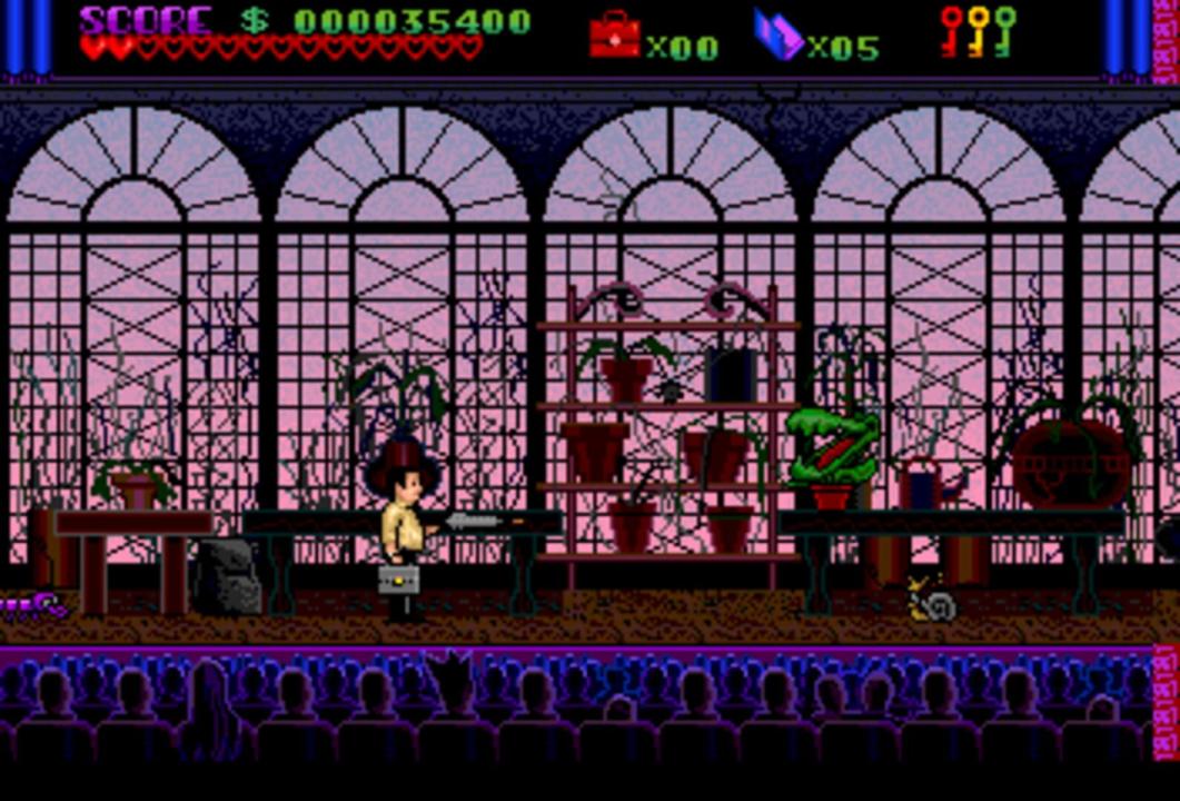 Based on the Addams Family movie, the TurboGrafx-16 CD version is quite different from the other Addams Family variants. The player is cast in the role of Tully Alford, the crooked lawyer of the Addams family. He finds out that somewhere in the family mansion, a great treasure is stored in a vault. He decides to venture into the mansion and retrieve the treasure. Naturally, this is going to be anything but easy, as the insane Addams family members and a legion of ghosts and monsters are there to make sure the lawyer fails... Like most other Addams Family incarnations, this is a side-scrolling action game. Tully Alford's only weapon is an umbrella that fires energy shots at enemies. Tully can also jump and duck to avoid enemy blows. The game world consists of a "hub" area, the hall of Addams Family mansion, and many rooms, most of which are locked in the beginning of the game. The gameplay consists mainly of exploring the accessible rooms and collecting keys that are needed to open other doors in the process. Some of the rooms contain treasure and power-ups, while others are infested by monsters or require the player to defeat a boss enemy in order to advance.
