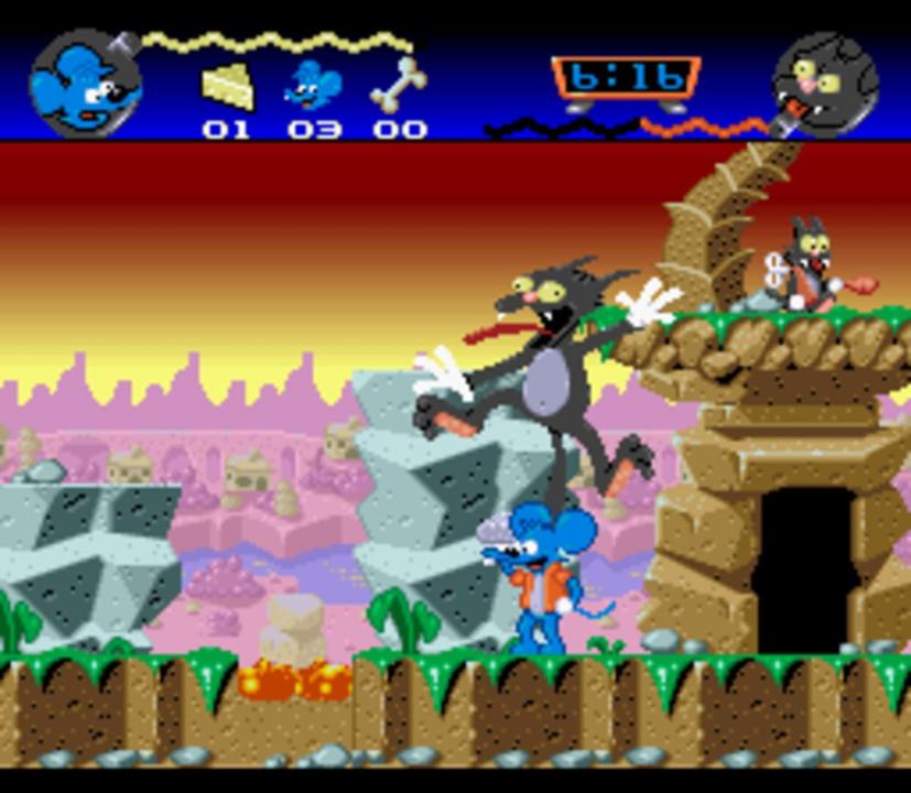 The Itchy & Scratchy Game is a single player platform side-scroller. The player controls Itchy, the mouse, and must defeat Scratchy, the cat, with a variety of weapons. Itchy caries a default mallet, but can pick up additional weapons on particular levels. Each of the seven levels takes place in a different fictional location and is designed as a maze of doors and platforms. After defeating Scratchy, he will usually return with a special contraption to attack Itchy, and must therefore be defeated again.