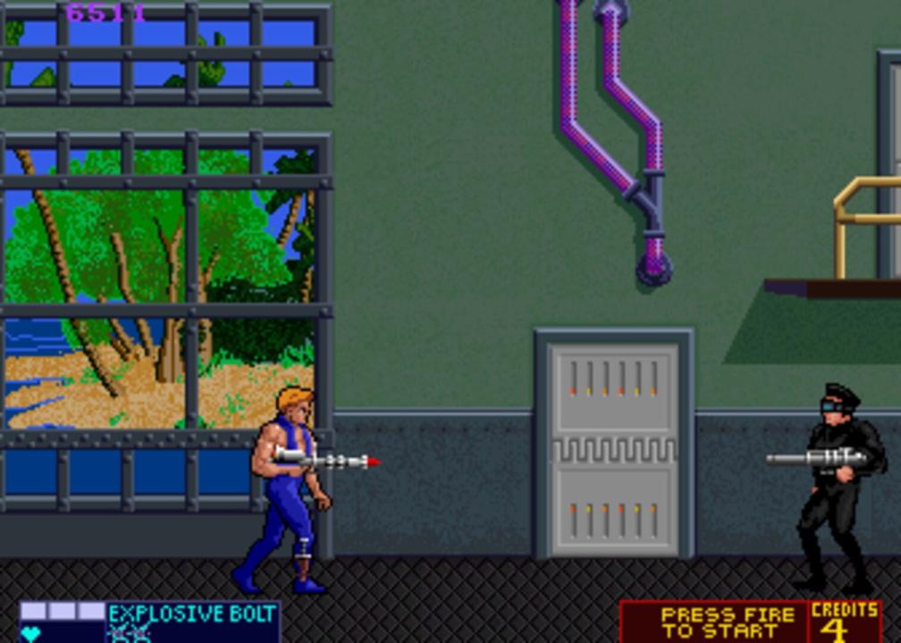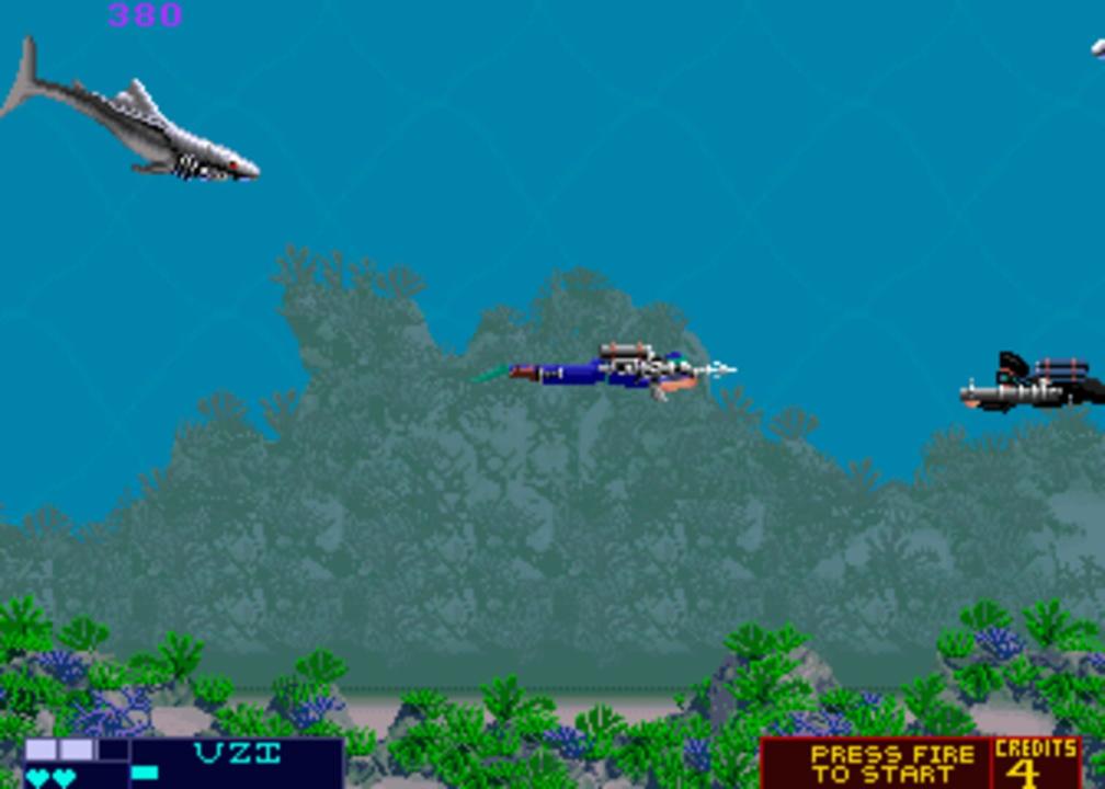 Take the plunge, dive into the deep and confront cybernetic sharks, enemy divers and all manner of evil - the work of the devilish Madame Q. Your mission: infiltrate her base, rescue hostages and destroy her subterranean fortress. Pick up flame throwers, defeat the hordes of henchmen and battle with armies of monstrous genetic mutants. This furious shoot out gives no respite. The action's non-stop from the start of this fantastic multi-level extravaganza. Gulping Excitement to the very last Bite!!