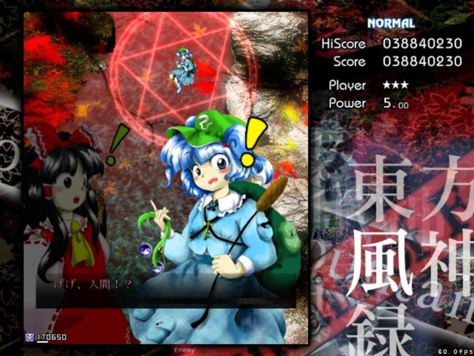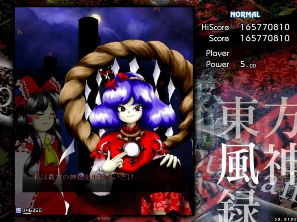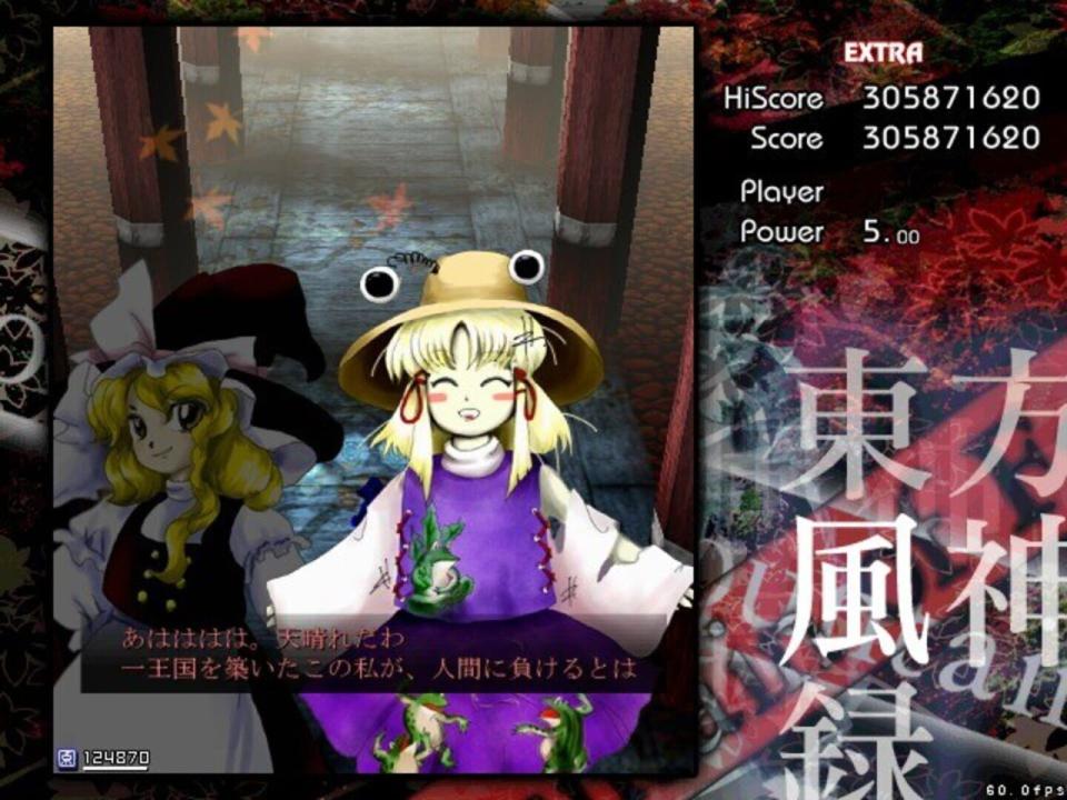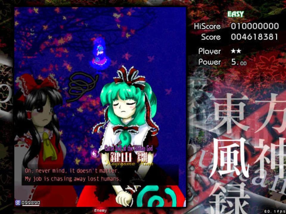 BACKSTORY Autumn has come to Gensokyo, and to its only shrine, the Hakurei Shrine, a common meeting place for its youkai that was seldom visited by its humans. As a result, faith in the Hakurei Shrine's deity began to fall like the leaves from the trees. It's in such a season that Reimu Hakurei, the shrine maiden of the Hakurei shrine, is visited by a mysterious stranger who claims to represent a god of mountains and orders her to shut the shrine's doors for good. Reimu is deeply troubled by this state of affairs, as she knows the shrine can't be allowed to close down due to the role it plays in watching over the Great Hakurei Border. Marisa Kirisame, her ordinary magician friend, is suspicious and also suitably bored. PROLOGUE Depending on who you choose, one of these girls finally decides to ascend the Youkai Mountain to confront the mysterious deity behind the threats. MAIN SCENARIO En route to the mountain, the heroine encounters several of Gensokyo's myriad gods, including two spirits of autumn, Shizuha Aki and Minoriko Aki, and a curse god, Hina Kagiyama, who tries to chase her away from the dangers of the mountain (unsuccessfully). As our heroine reaches the foot of the mountain and begins to climb it, another youkai appears to try to convince her to leave - Nitori Kawashiro, the valley kappa. After Nitori's equally unsuccessful bid to get her to go away, she mentions that a god has recently appeared on the mountain, causing some trouble for the tengu and kappa that live there. Ascending the waterfall that fed the rivers Nitori swam in, the heroine faces the forces that guard the mountain from outside influence, including Momiji Inubashiri and the traditional tengu reporter, Aya Shameimaru, who was sent to investigate by the leaders of the tengu society due to her familiarity with outsiders. Aya puts up a token fight, but eventually allows the human interloper to pass on to the lake where a new shrine, the Moriya Shrine, has appeared. As she enters the grounds, she is confronted by a new shrine maiden - Sanae Kochiya. Sanae says that the lake and the Moriya Shrine were both recently moved to Gensokyo, and that she intends to collect all of Gensokyo's faith for "Lady Yasaka". Naturally, to do that would mean the end of the Hakurei Shrine, to which our heroine objects, leading to a battle where Sanae is ultimately defeated. At the top of the mountain, our heroine finds a lake surrounded by pillars, and Kanako Yasaka. Kanako, a goddess of the wind and rain, seeks to gain all of Gensokyo's faith in order to prevent the declining level of faith in Gensokyo to reach the point where its gods lose their power. Were such a thing to happen, she believes, Gensokyo would fall into a state of chaos. After a protracted battle, however, Kanako is convinced to make peace with the tengu and kappa, who are also convinced to accept her as the goddess of the Youkai Mountain.