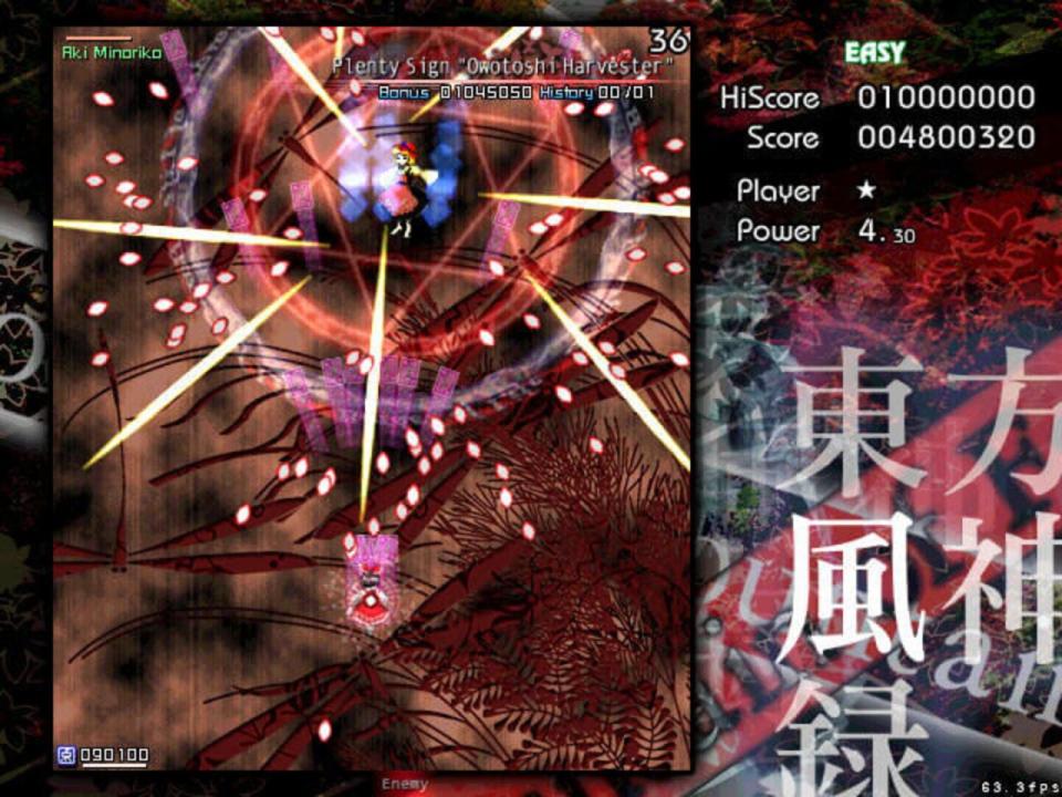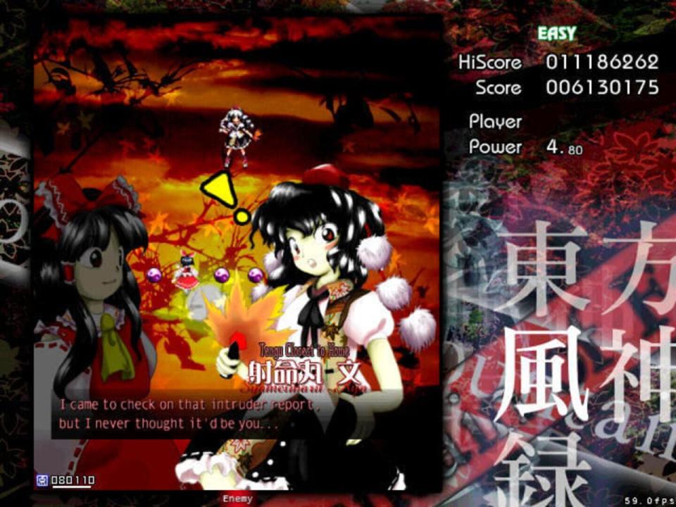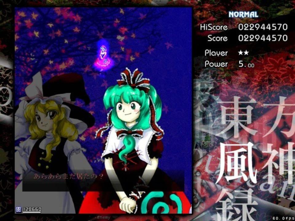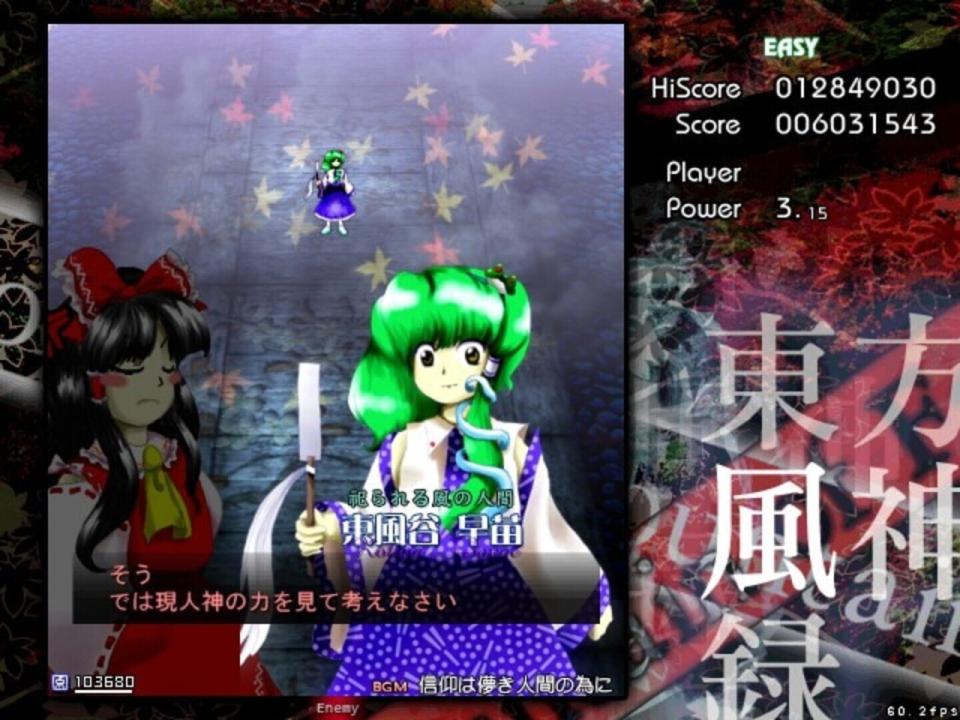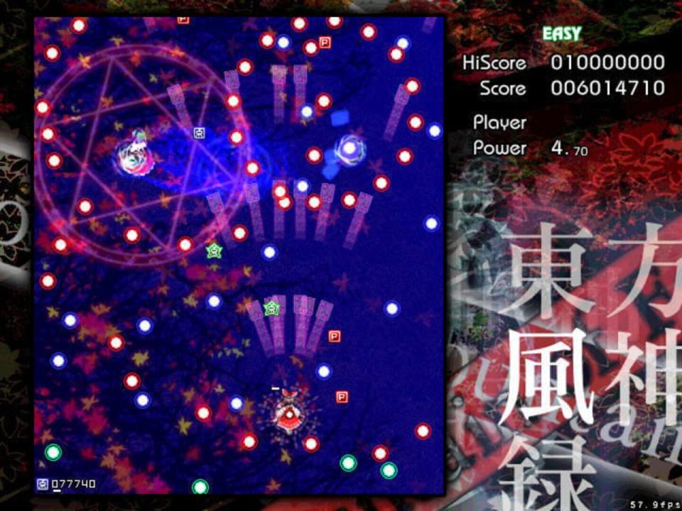BACKSTORY Autumn has come to Gensokyo, and to its only shrine, the Hakurei Shrine, a common meeting place for its youkai that was seldom visited by its humans. As a result, faith in the Hakurei Shrine's deity began to fall like the leaves from the trees. It's in such a season that Reimu Hakurei, the shrine maiden of the Hakurei shrine, is visited by a mysterious stranger who claims to represent a god of mountains and orders her to shut the shrine's doors for good. Reimu is deeply troubled by this state of affairs, as she knows the shrine can't be allowed to close down due to the role it plays in watching over the Great Hakurei Border. Marisa Kirisame, her ordinary magician friend, is suspicious and also suitably bored. PROLOGUE Depending on who you choose, one of these girls finally decides to ascend the Youkai Mountain to confront the mysterious deity behind the threats. MAIN SCENARIO En route to the mountain, the heroine encounters several of Gensokyo's myriad gods, including two spirits of autumn, Shizuha Aki and Minoriko Aki, and a curse god, Hina Kagiyama, who tries to chase her away from the dangers of the mountain (unsuccessfully). As our heroine reaches the foot of the mountain and begins to climb it, another youkai appears to try to convince her to leave - Nitori Kawashiro, the valley kappa. After Nitori's equally unsuccessful bid to get her to go away, she mentions that a god has recently appeared on the mountain, causing some trouble for the tengu and kappa that live there. Ascending the waterfall that fed the rivers Nitori swam in, the heroine faces the forces that guard the mountain from outside influence, including Momiji Inubashiri and the traditional tengu reporter, Aya Shameimaru, who was sent to investigate by the leaders of the tengu society due to her familiarity with outsiders. Aya puts up a token fight, but eventually allows the human interloper to pass on to the lake where a new shrine, the Moriya Shrine, has appeared. As she enters the grounds, she is confronted by a new shrine maiden - Sanae Kochiya. Sanae says that the lake and the Moriya Shrine were both recently moved to Gensokyo, and that she intends to collect all of Gensokyo's faith for "Lady Yasaka". Naturally, to do that would mean the end of the Hakurei Shrine, to which our heroine objects, leading to a battle where Sanae is ultimately defeated. At the top of the mountain, our heroine finds a lake surrounded by pillars, and Kanako Yasaka. Kanako, a goddess of the wind and rain, seeks to gain all of Gensokyo's faith in order to prevent the declining level of faith in Gensokyo to reach the point where its gods lose their power. Were such a thing to happen, she believes, Gensokyo would fall into a state of chaos. After a protracted battle, however, Kanako is convinced to make peace with the tengu and kappa, who are also convinced to accept her as the goddess of the Youkai Mountain.