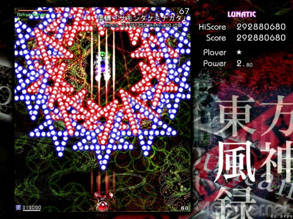 Mountain of Faith features two playable characters, each with three weapon types, but no personalized spell card bombs. Collecting power items results in an increase in "option" satellites around the character (for a total of four), which behave differently according to the character and weapon type. Each characters' options also fire bullets, and either shift position or freeze in place in focus-fire mode. The scoring system is based on the Faith meter, which has a refillable gauge and a numeric value (minimum 50,000). As long as the gauge is not empty, the player's Faith value doesn't decrease, but the gauge slowly depletes unless the player is defeating enemies or collecting point items. Point items also partially refill the gauge, and Faith items increase the Faith value. The Faith value directly affects the point value of point items and spell card bonuses.