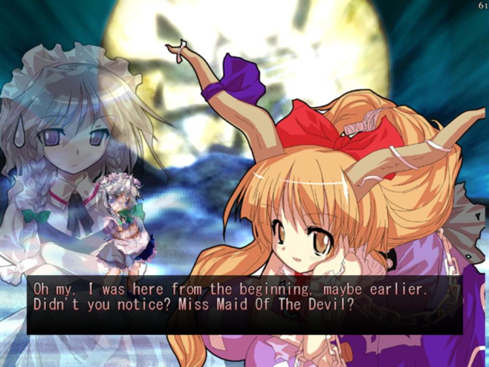 Gensokyo has settled down after the Spring Snow Incident that occurred in Perfect Cherry Blossom. Reimu Hakurei and the others are currently having a feast every three days at the Hakurei shrine. During these feasts, a strange mist appears. The playable character decides to get the cause of the never-ending feast schedule and the mist. This incident was later called the "Night Parade of One Hundred Oni Every Four Days" by Aya Shameimaru in Bohemian Archive in Japanese Red. The perpetrator of the incident is an oni, said to have disappeared from Gensokyo, named Suika Ibuki. She thought that it was a shame that the flower-viewing season had been cut short due to the very long winter. She spread herself out in the form of a mist all throughout Gensokyo, and "gathered" the hearts of both humans and youkai to cause them to have a feast every few days. Because the art of oni extermination has been lost to Gensokyo, the girls could not eliminate her, but the mist disappeared afterwards and feasts started to happen less frequently.