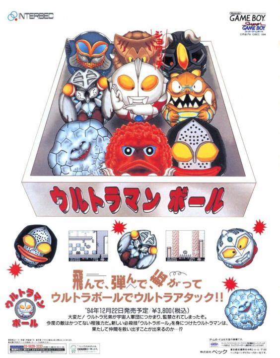 Ultraman Ball is a 2D platformer for the Nintendo Game Boy and features the Tsuburaya Productions tokusatsu character Ultraman and his companions. Ultraman is re-imagined as a hero who is able to transform into a ball mode, and uses this new power to save his friends.