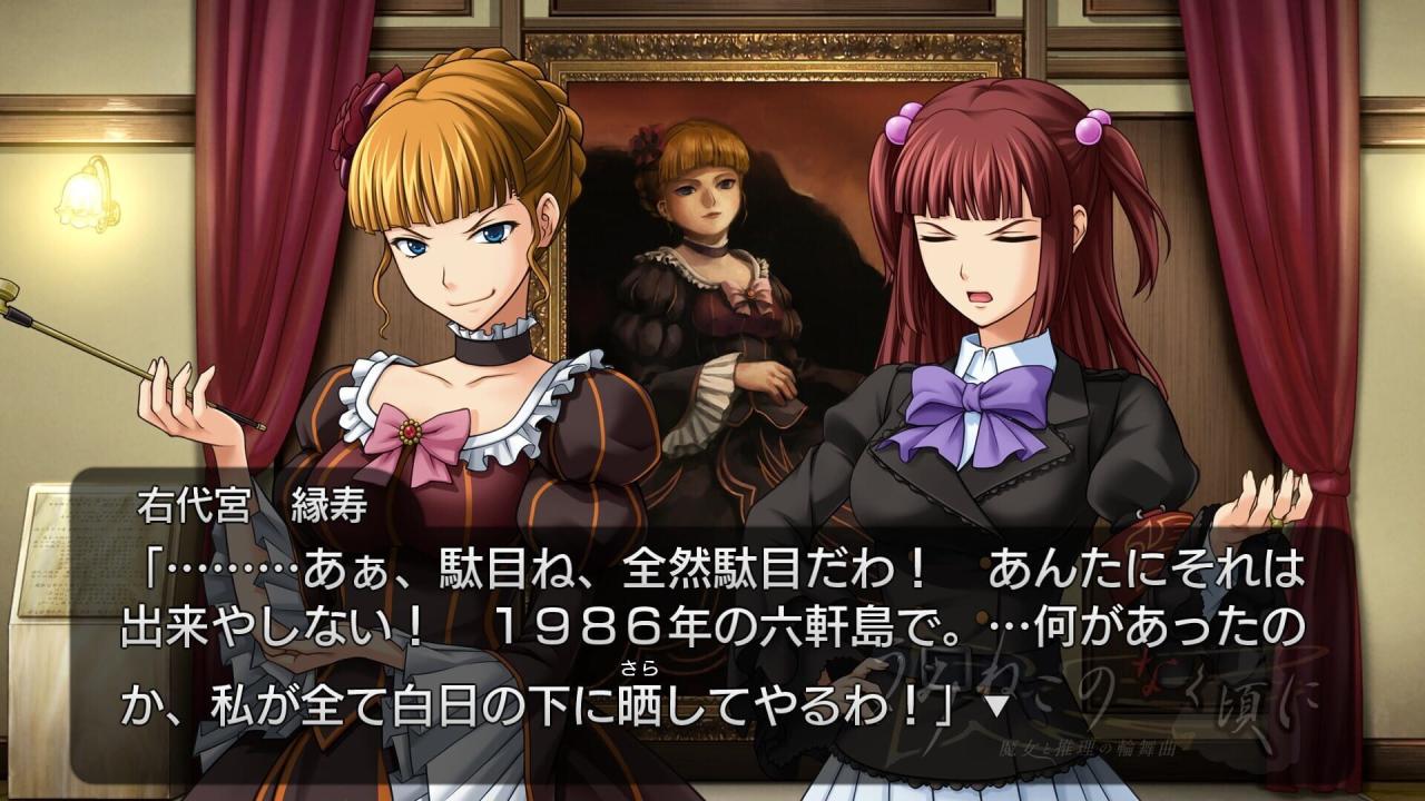 October 4 and 5, 1986. The Ushiromiya family has gathered on the private island of Rokkenjima for their annual family conference. Chief on the agenda concerns the struggle for the inheritance assets of the ailing family head, Kinzo. But as the family is trapped on the island by a typhoon, they receive a letter claiming to be from the rumored witch of the island, Beatrice, and mysterious events begin to occur.