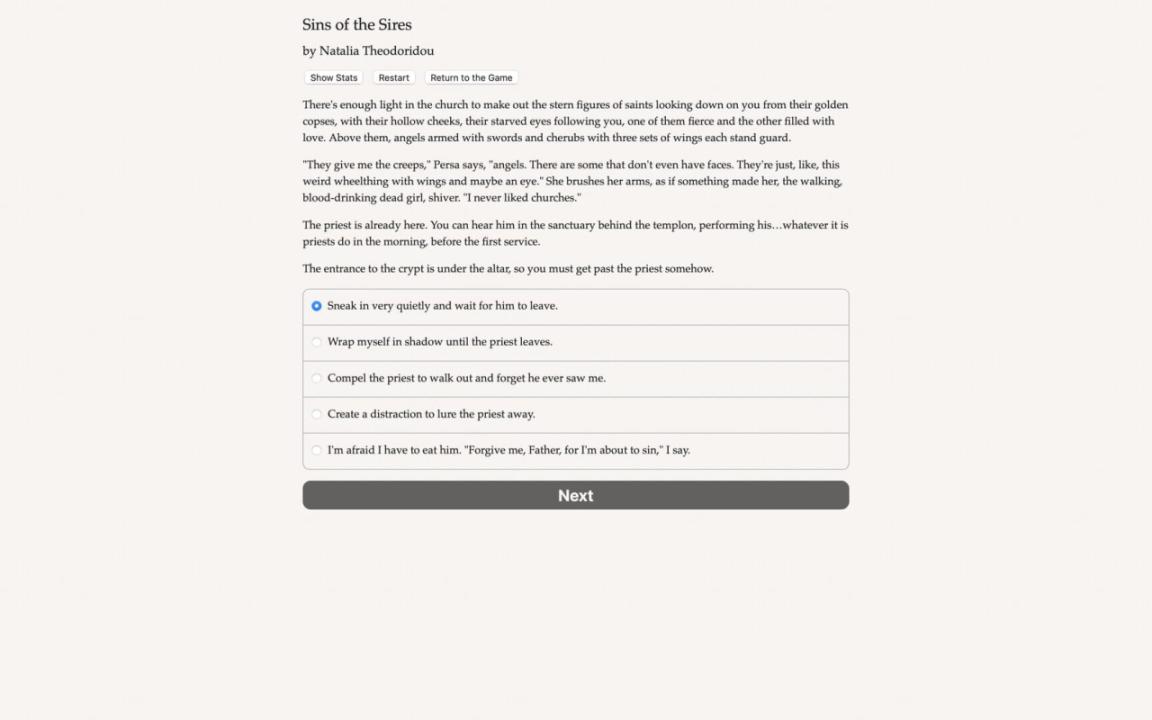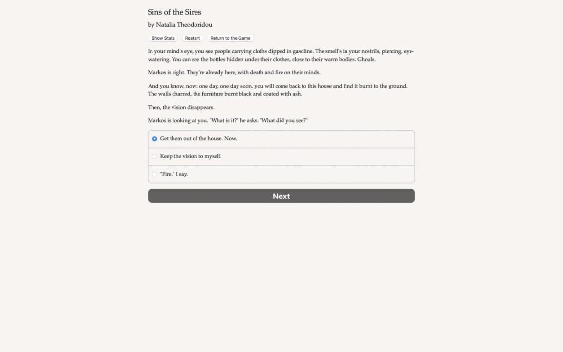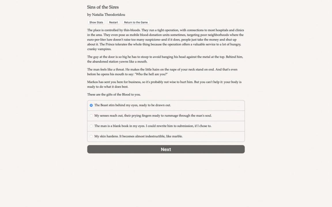In this elegy of blood, everyone in Athens owes your boss a favor, making you untouchable! Who will you use, who will you help, and who will you prey on? Vampire: The Masquerade - Sins of the Sires is an interactive novel by Natalia Theodoridou. It's entirely text-based, 300,000 words, without graphics or sound effects, and fueled by the vast, unstoppable power of your imagination.