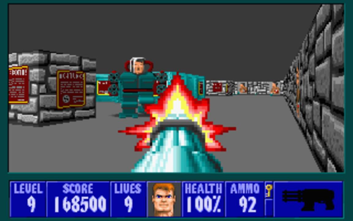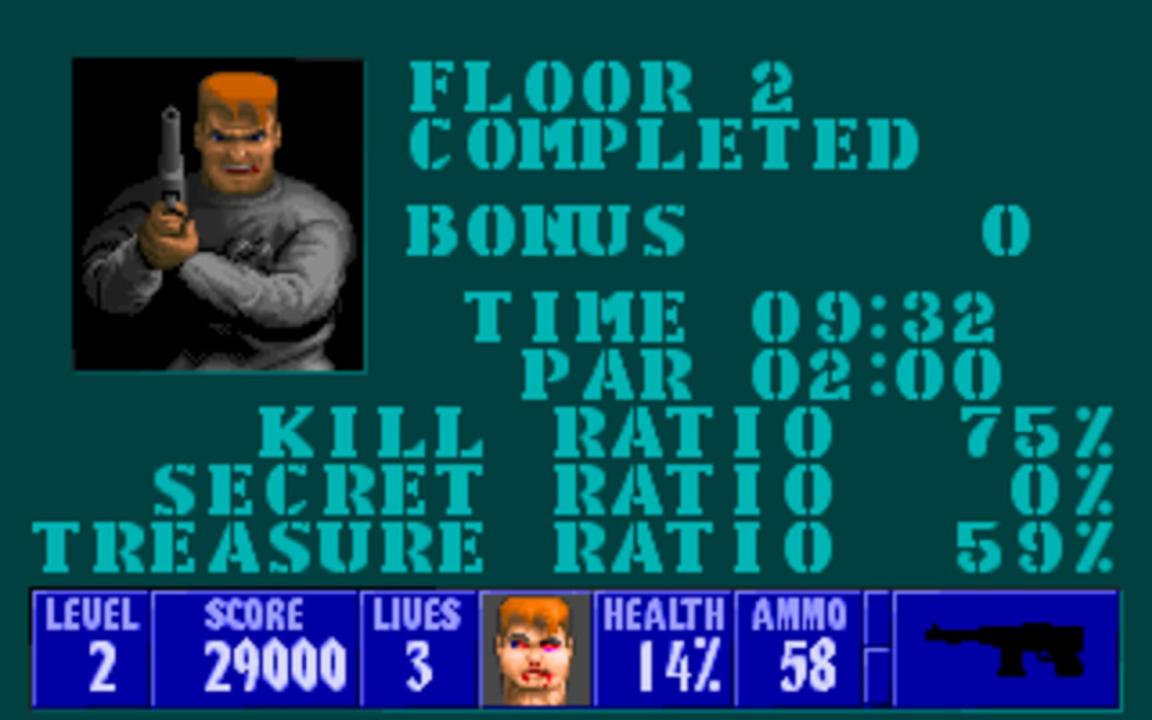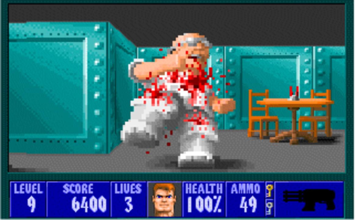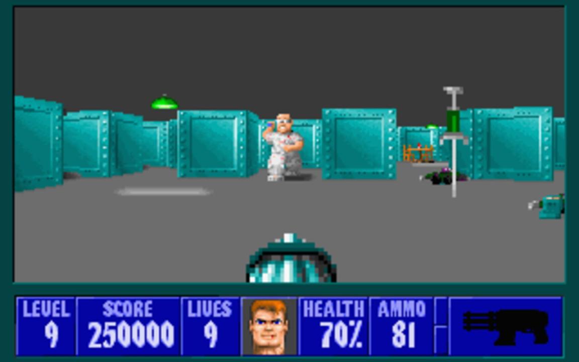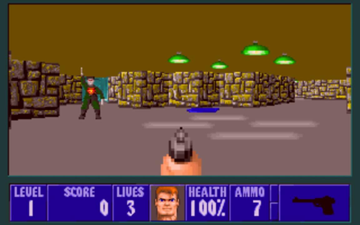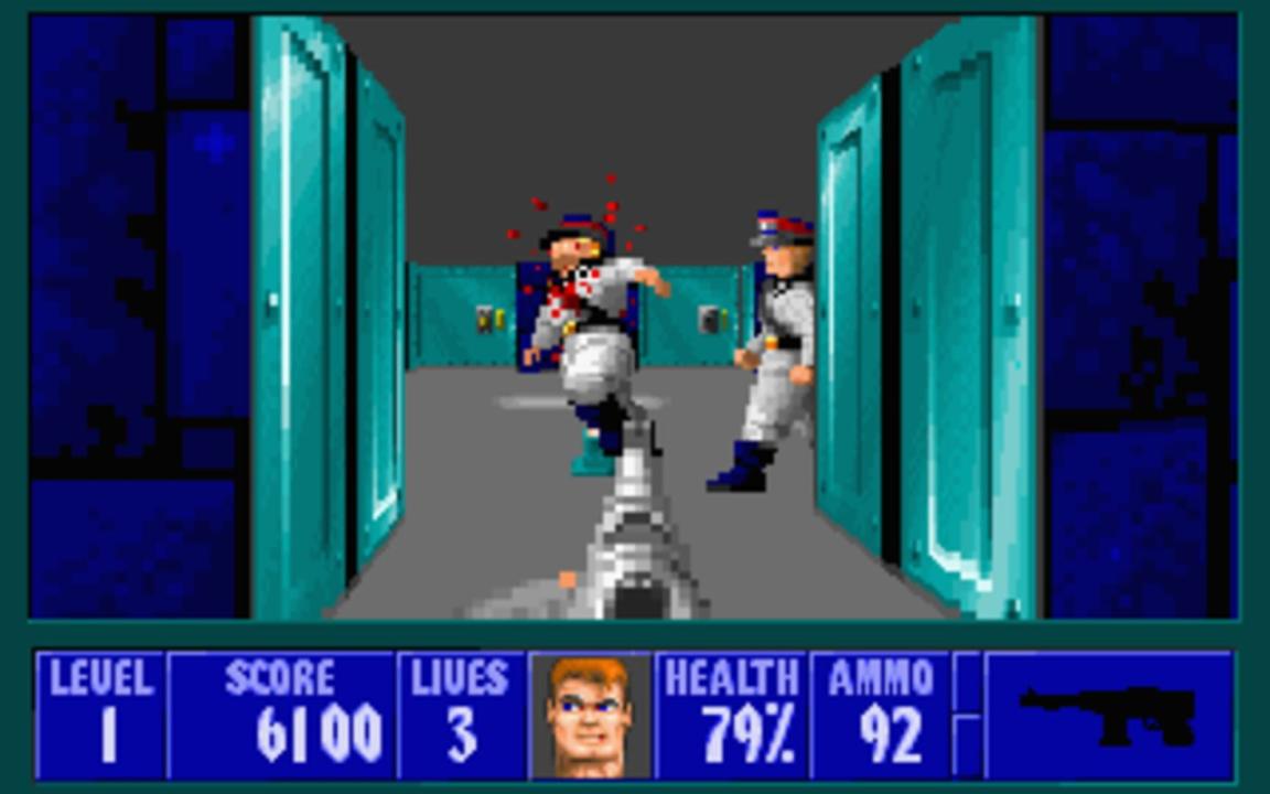 Wolfenstein 3D is a first-person shooter presented with rudimentary 3D graphics and a follow-up to the top-down infiltration game Castle Wolfenstein. The game is broken up into levels, each of which is a flat plane divided into areas and rooms by a grid-based pattern of walls and doors, all of equal height. Each level is themed after Nazi bunkers and buildings. To finish a level, the player must traverse through the area to reach an elevator. Levels are grouped together into named episodes, with the final level focusing on a boss fight with a particularly difficult enemy. While traversing the levels, the player must fight Nazi guards and soldiers, dogs, and other enemies while managing supplies of ammunition and health. While later releases of the game included the Nocturnal Missions expansion, this initial release did not.