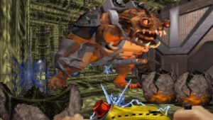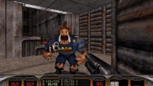 Außerirdische sind im futuristischen Los Angeles gelandet, und es liegt an dem Herzog, den Schmerz zu bringen und ihnen die Tür zu zeigen. Nach den ersten Einträgen von Side-Scrolling-Plattformspielen führt Duke Nukem 3D eine First-Person-Perspektive in die Serie ein und macht das Spiel zu einem vollwertigen Shooter mit 2,5D-Grafik.
